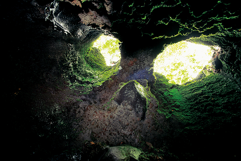 ある日不思議な樹型溶岩を見つけた。地上には二つの大きな穴が開いていて深さ四~五メートル、地下では一つのホールになっていた。縄バシゴを降ろしてさっそく入る。穴の底に着くと八畳くらいの広い空間があった。・・・私は二つの穴の真ん中に立ち、三脚を立てカメラを載せた。・・・二つの穴は人の目のようで地上から地下に向かって私を睨んでいるようでもあった。・・・
