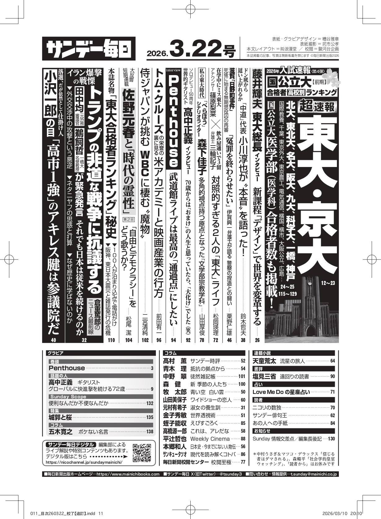 ・〔サンデー毎日目次〕2026.3.22号